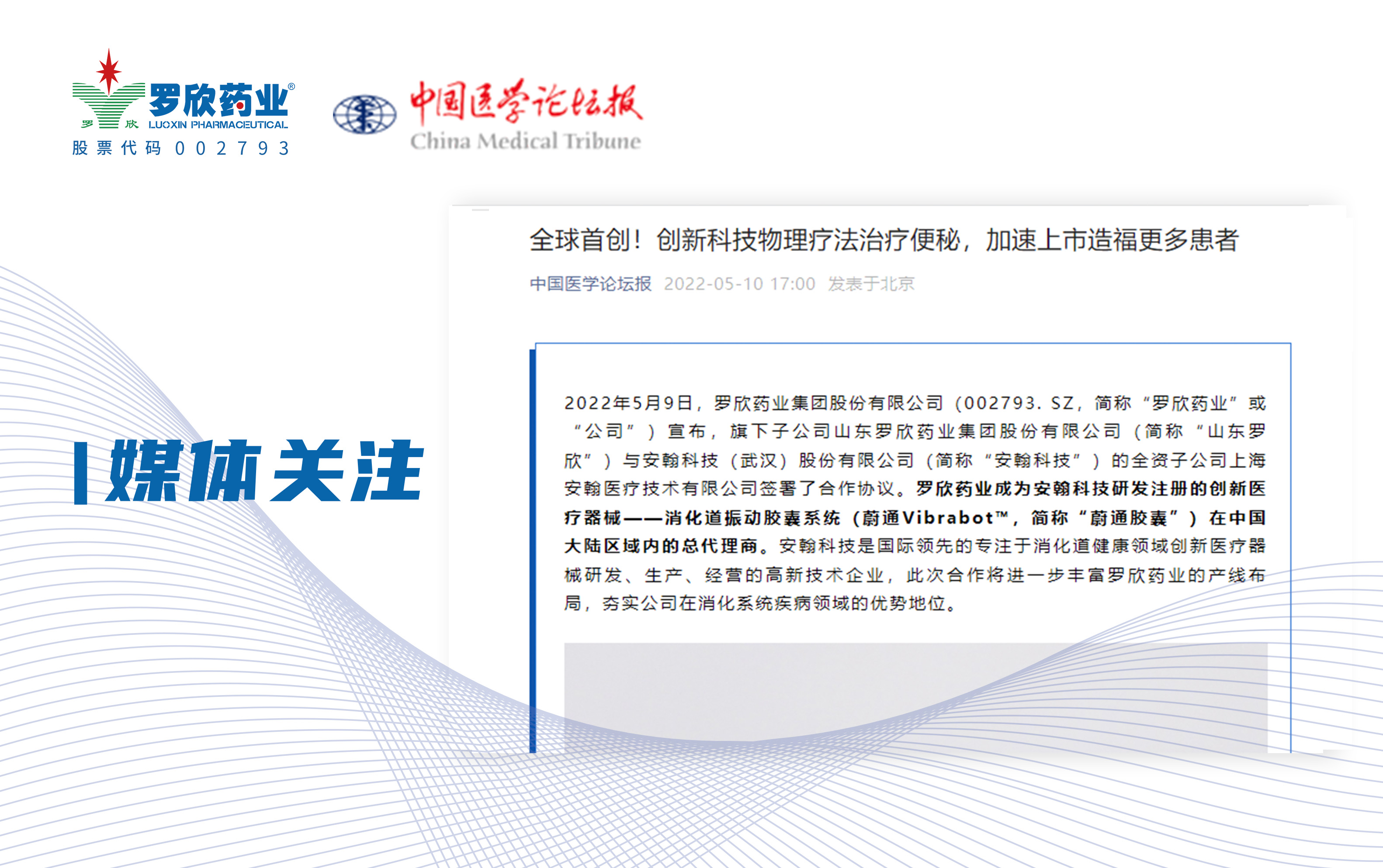 2022年5月9日,罗欣药业集团股份有限公司旗����� �������Ƴ����������� �������Ƴ������������ �������Ƴ������������ �������Ƴ�������下子公司山东罗欣药业集团股份有限公司)与安翰科技����� �������Ƴ������������ �������Ƴ����������� �������Ƴ������������ �������Ƴ�������(武汉)股份有限公司的全资子公司����� �������Ƴ������������ �������Ƴ����������� �������Ƴ����������� �������Ƴ�������上海安翰医疗技术有限公司签署了合作协议。����� �������Ƴ������������ �������Ƴ������������ �������Ƴ������������ �������Ƴ�������罗欣药业成为安翰科技研发注册����� �������Ƴ����������� �������Ƴ����������� �������Ƴ������������ �������Ƴ�������的创新医疗器械——消化道振动胶囊系统(蔚通Vi����� �������Ƴ����������� �������Ƴ������������ �������Ƴ������������ �������Ƴ�������brabot™,简称“蔚通胶囊����� �������Ƴ������������ �������Ƴ������������ �������Ƴ������������ �������Ƴ�������”)在中国大陆区域内的总代理商。